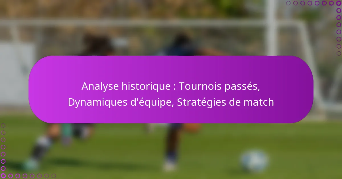 L’analyse historique des tournois passés révèle l’interaction complexe entre la dynamique d’équipe et les stratégies de match, illustrant comment ces éléments ont évolué au fil du temps. En examinant les jalons clés du sport, nous pouvons obtenir des informations sur le développement de la compétition et les approches tactiques qui ont façonné les résultats d’événements significatifs. Comprendre ces facteurs enrichit non seulement notre appréciation du sport, mais informe également les stratégies futures et les formations d’équipe.